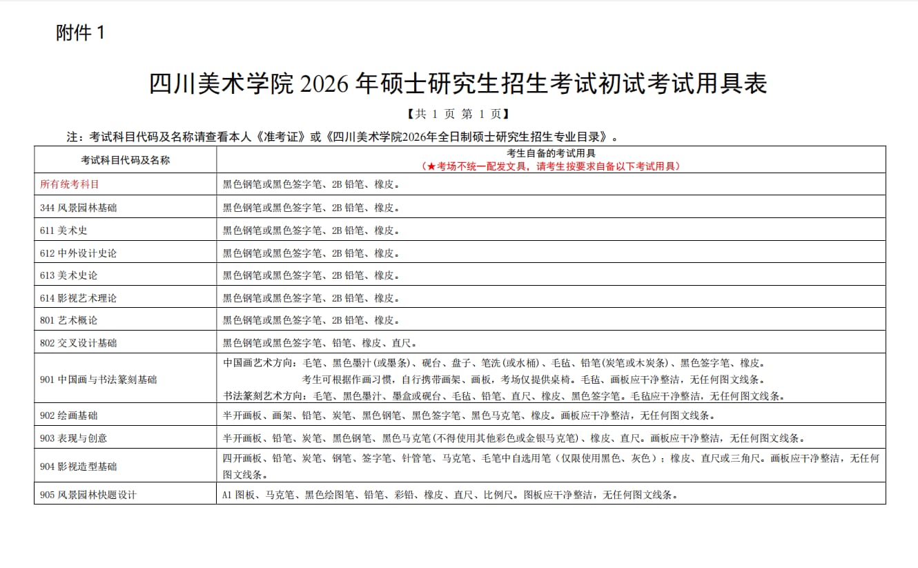 附件:1. 四川美术学院2026年硕士研究生招生考试初试考试用具表