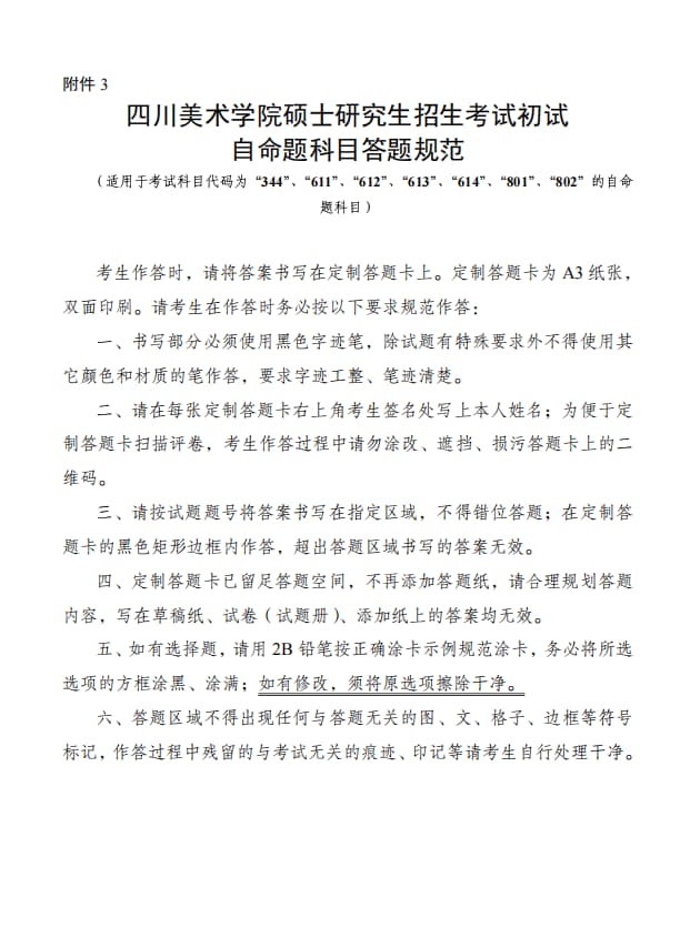 3. 四川美术学院硕士研究生招生考试初试自命题科目答题规范(适用于考试科目代码为“344”、“611”、“612”、“613”、“614”、“801”、“802”的自命题科目)